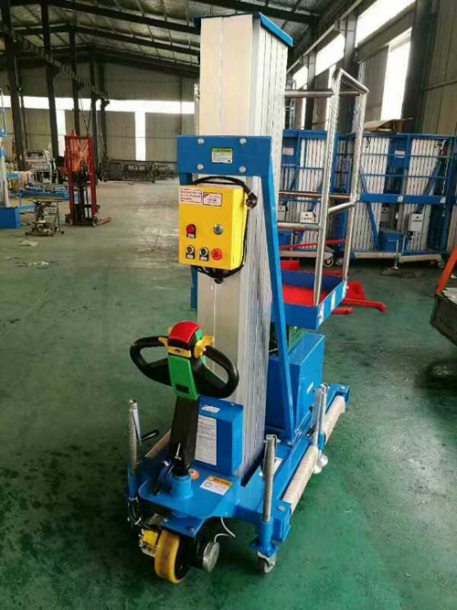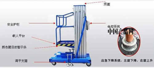 鋁合金升降機升高高度在8米以下為單跪柱式,在10米到14米之間為雙跪柱式,15米到18米之間則升為三跪柱式或四跪柱式。通過升降平臺跪柱的增加達到設備在高空的穩定性,保證作業安全,減小設備晃動的幅度,使高空作業更加平穩。該升降平臺配備了中德合資的液壓泵站,該泵站為壓鑄鋁集成閥塊,結構緊湊,系統壓力16MPa,經過液壓泵站帶動鏈條傳動,結構合理,設計緊湊。鋁合金式液壓升降平臺下降速度可自調,而且設備設有手動下降裝置,保證在停電時的正常工作;設有應急停運按鈕;臺面設有防滑絕緣扣板,更換方便,易于清潔,維修方便,有效保障工作安全可靠,保證使用人員的安全。外形美觀,整體輕盈,能在小的空間內發揮好的舉升功能,也可根據客戶要求加裝蓄電池以滿足客戶工作場地的不同要求。